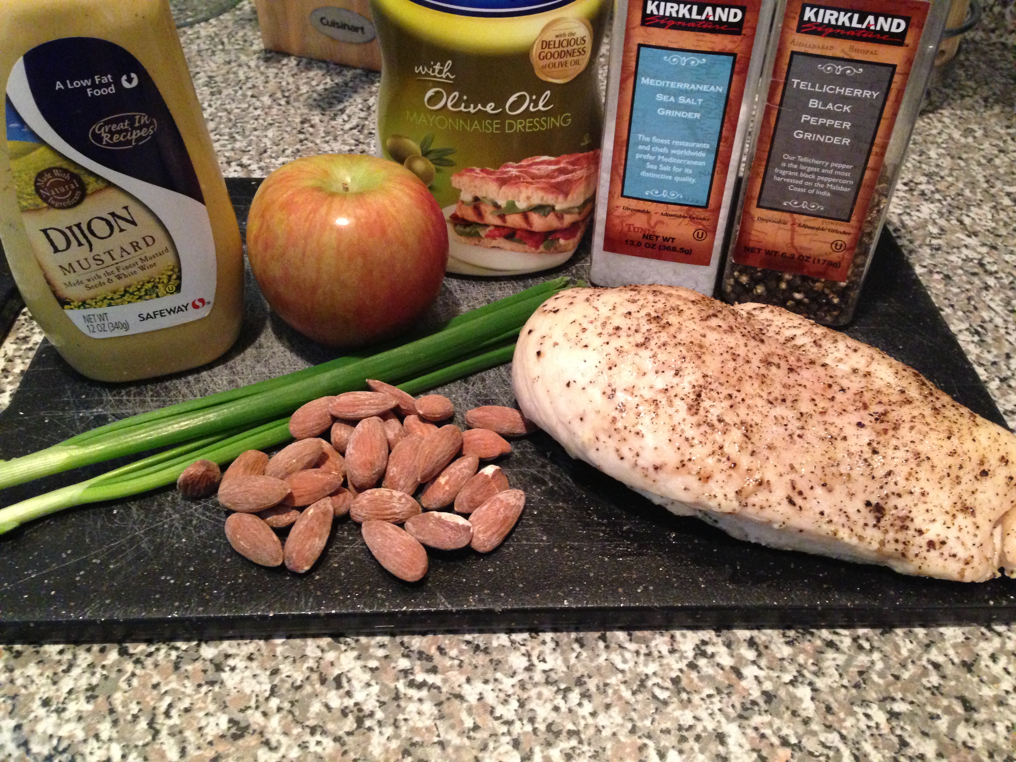 Slice the chicken breast in half lengthwise then cut into cubes.  Combine all chopped ingredients in bowl.