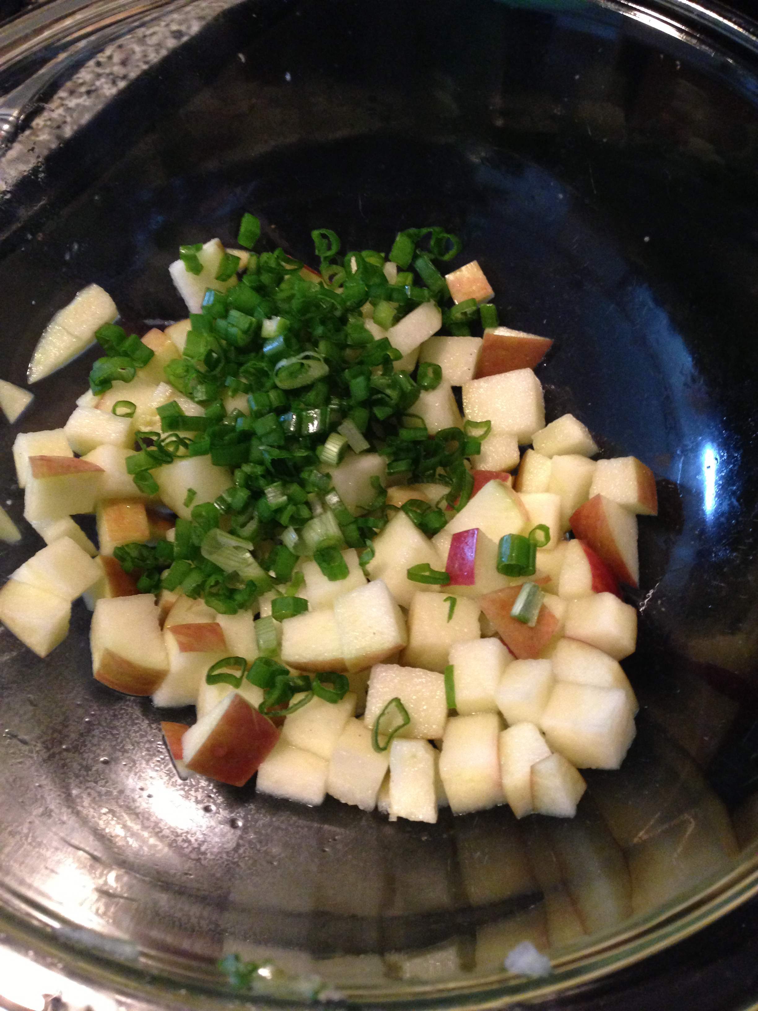 Chop the apple into cubes then place in a bowl and coat with a splash of lime juice to prevent browning. Chop the green onions into slivers (mainly green parts) and roughly chop the almonds.