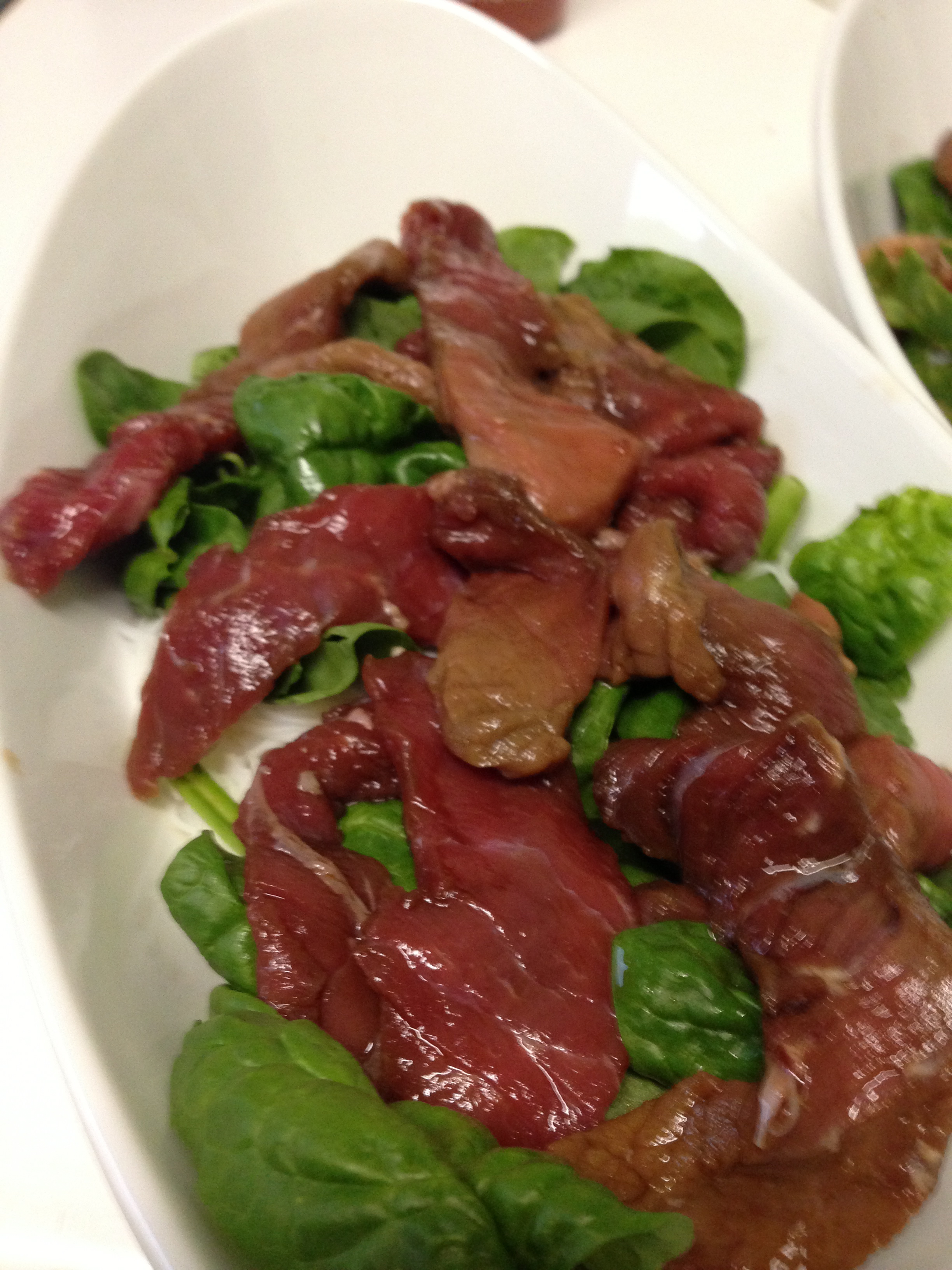 While the broth is simmering, prepare rice noodles according to package directions.  Once cooked, place the noodles in the bottom of the serving bowls.  Place fresh spinach on top of the noodles and place the raw steak (just the steak, not the garlic or soy sauce) evenly spread out over the bowl.  Try not to overlap the steak very much since the broth will actually cook the steak to rare in the bowl and if it is stacked on top of each other, it won’t cook properly.  See picture below.